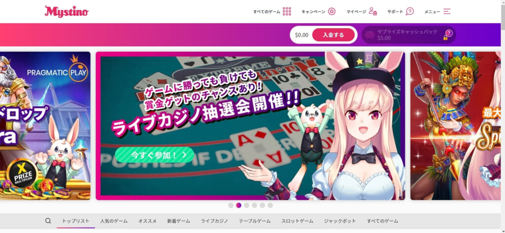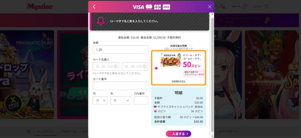 まずは300ドル未満の金額を入金し、ミスティーノの雰囲気を体験してみましょう。