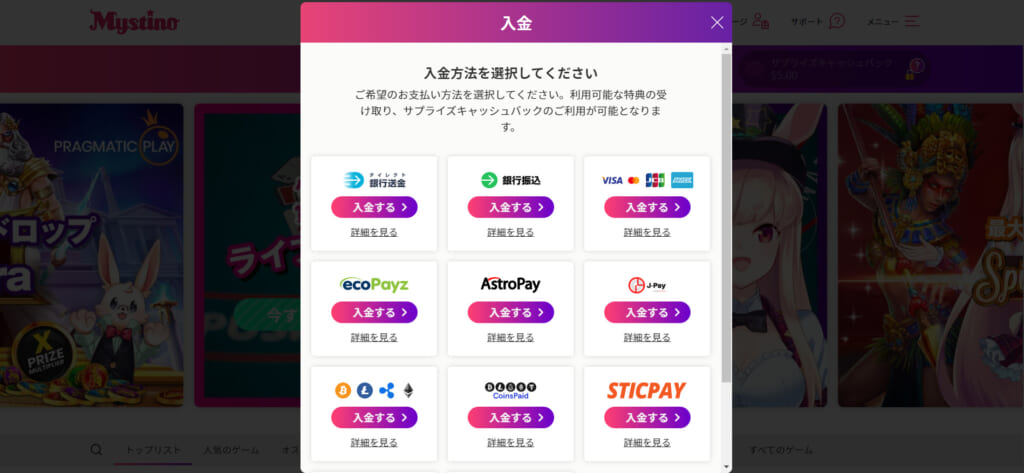 ミスティーノは、ほとんどの大手オンラインカジノで導入されている電子決済サービスを採用しています。